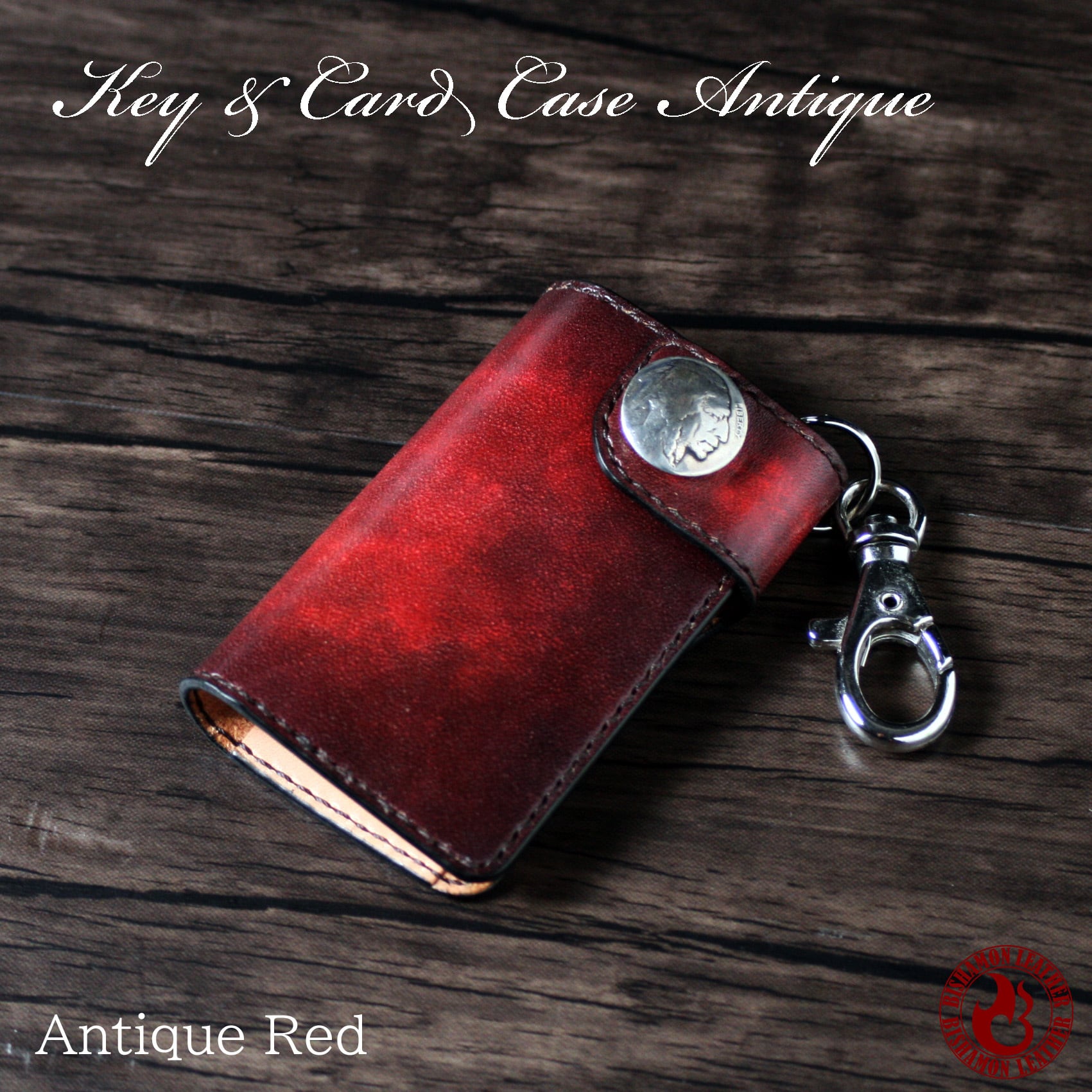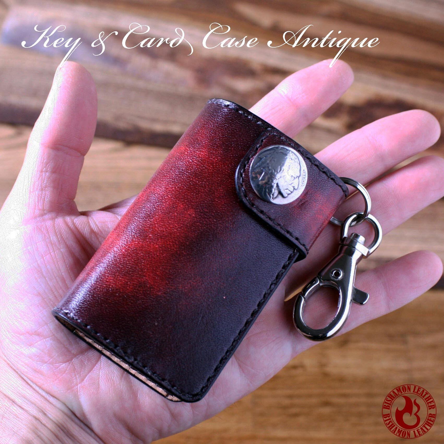 美しいアンティック染色仕上げのキー&カードケース。5連キーホルダーとカードポケットが1つ付いています。素材は牛革(栃木レザー)を使用。フラップのコンチョには本物のアメリカ5セント硬貨を使用。コンチョの柄はインディアンかバッファローを選択可能。